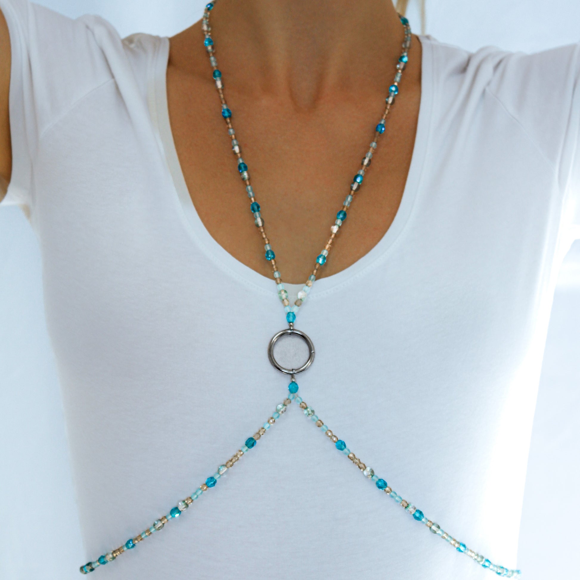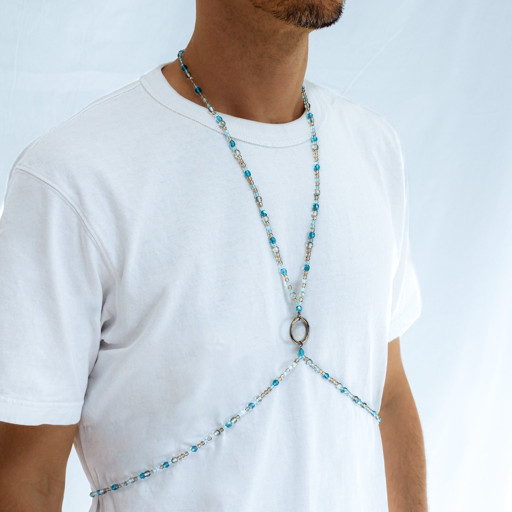 Unsere AZURE:51BC — eine handgefertigte Körperkette, die einzigartige tschechische Glasperlen mit auffälligen Edelstahlelementen vereint. Dieses Schmuckstück passt sich wunderbar deinem Körper an und lässt selbst das einfachste Outfit erstrahlen. Ob tagsüber oder bei einem Konzert im Nachtleben, dein Auftritt wird auffallen.