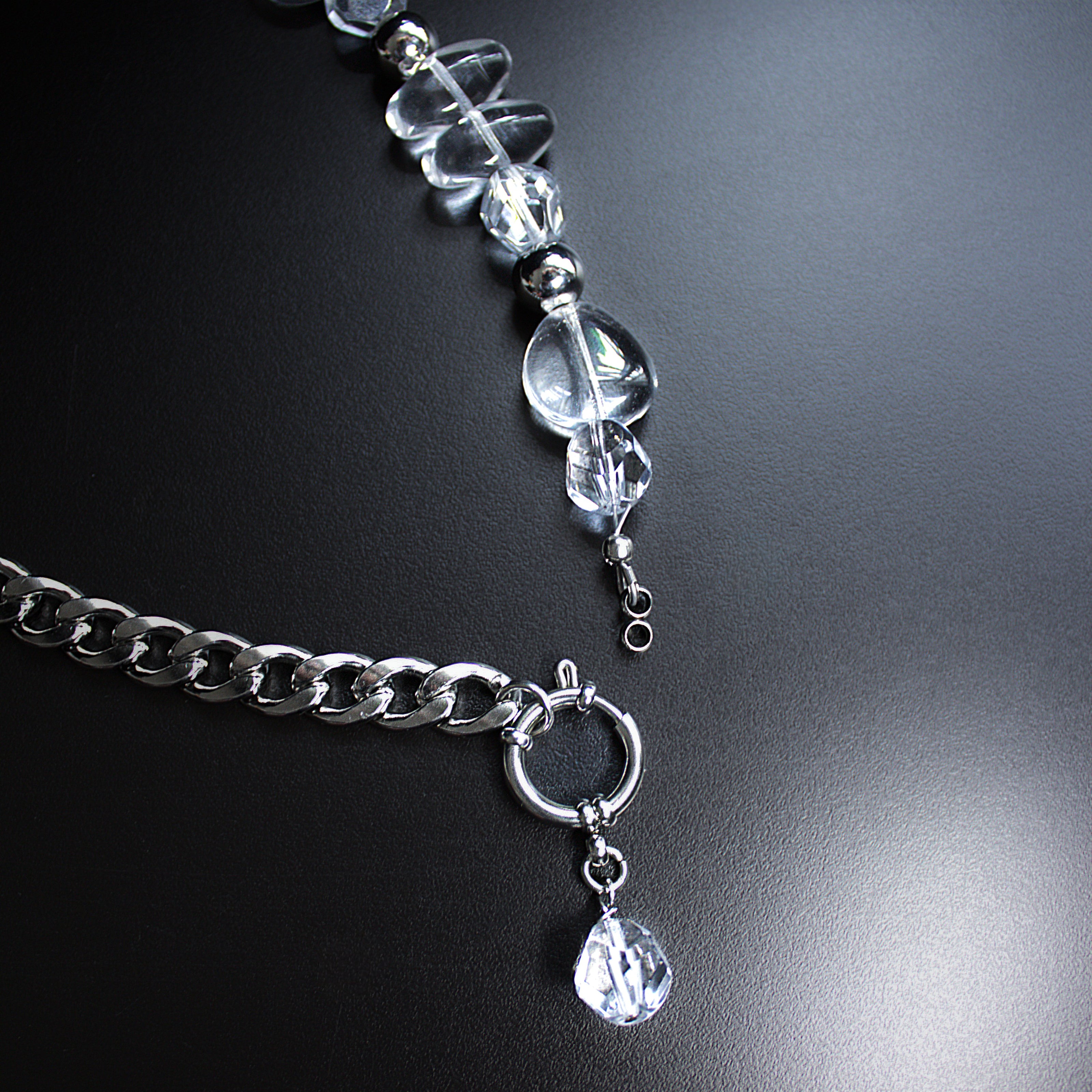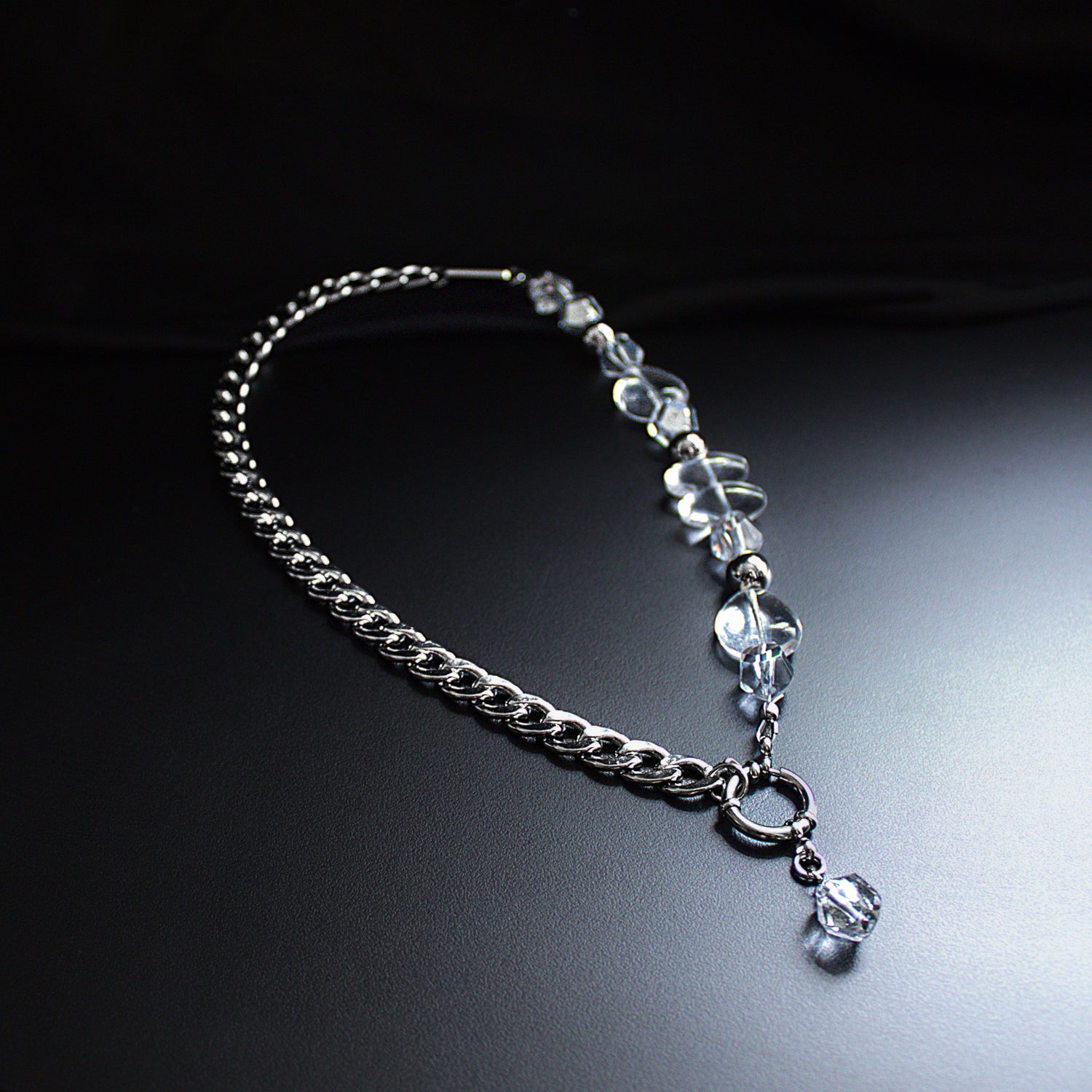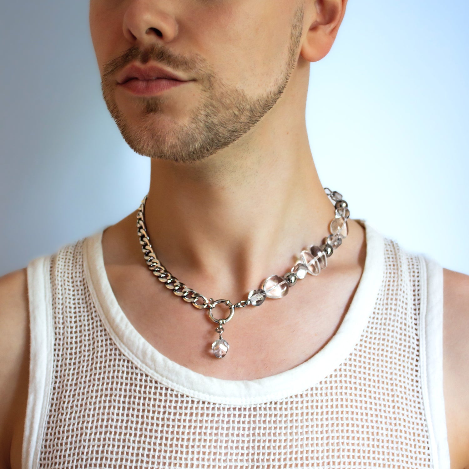 Die Halskette : 14PB aus unserer Paradise Blues Kollektion vereint urbane Stärke mit elegantem Glanz. Handgefertigt in Berlin, besteht die Kette aus einem Mix aus Edelstahl-Gliederkette und tschechischen Glasperlen in durchsichtiger, silberschimmernder Farbe. Der besondere Clou: der Verschluss sitzt vorne und ist mit einem zarten Glasperlenanhänger verziert, der dem Design ein einzigartiges Highlight verleiht.