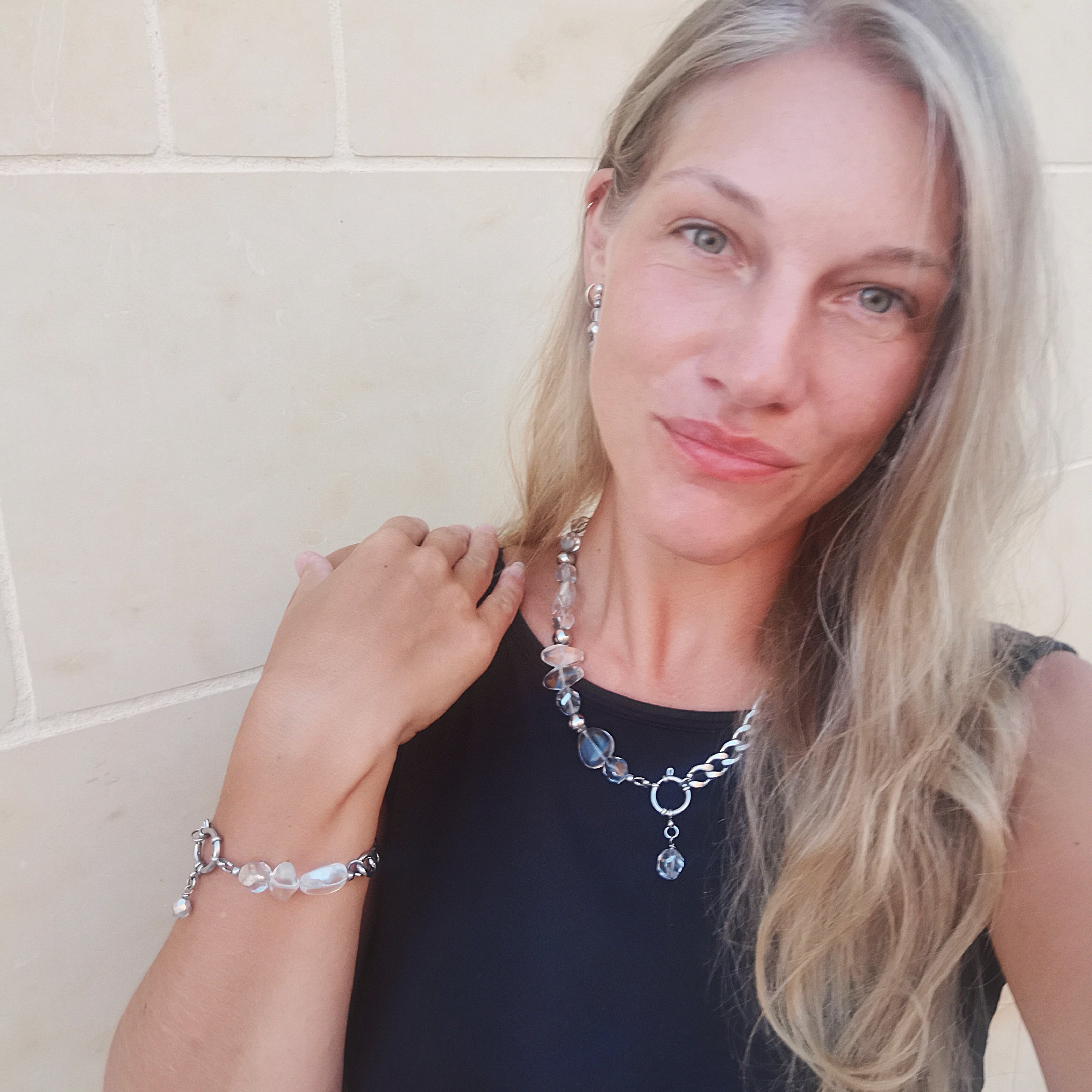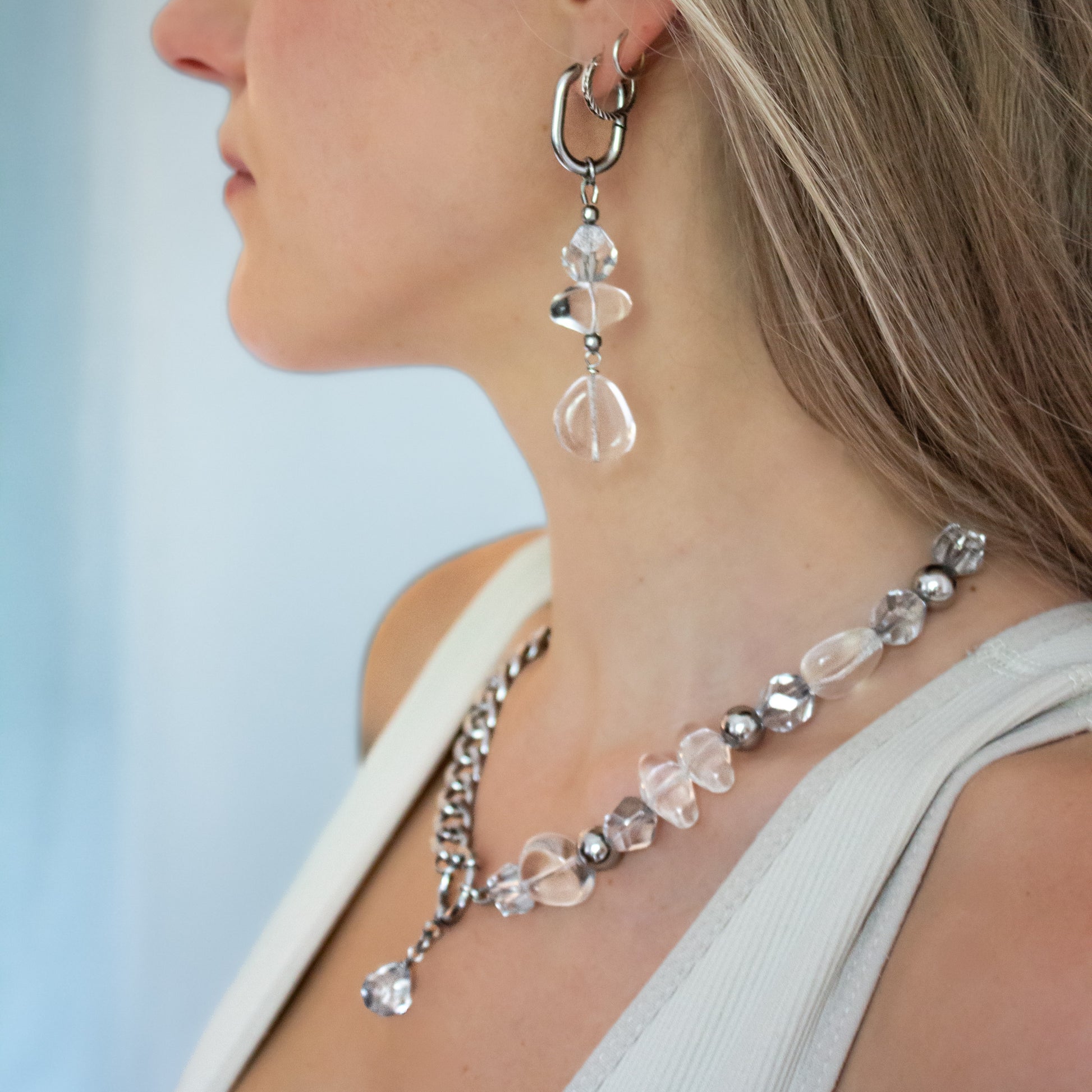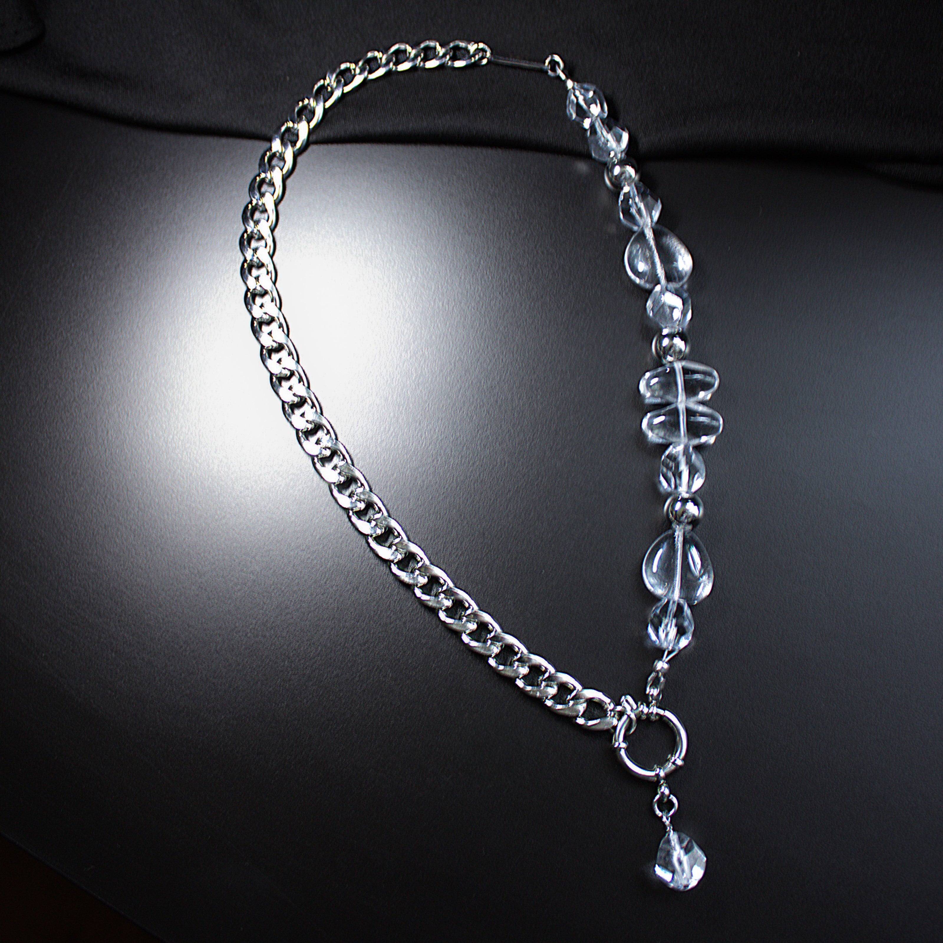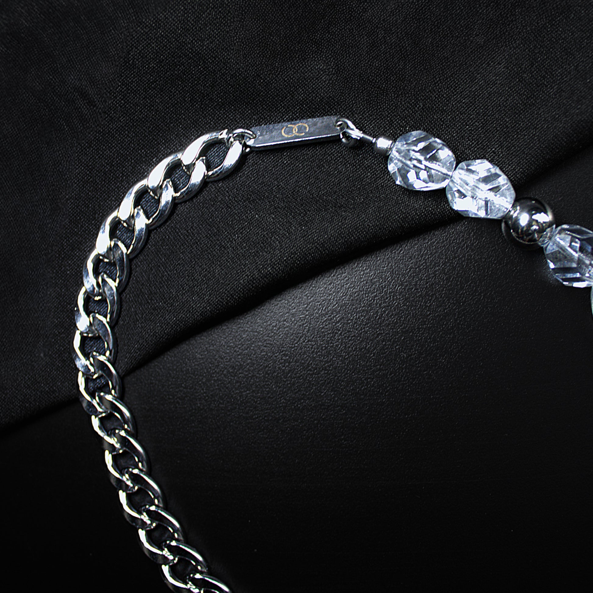 Die Halskette : 14PB aus unserer Paradise Blues Kollektion vereint urbane Stärke mit elegantem Glanz. Handgefertigt in Berlin, besteht die Kette aus einem Mix aus Edelstahl-Gliederkette und tschechischen Glasperlen in durchsichtiger, silberschimmernder Farbe. Der besondere Clou: der Verschluss sitzt vorne und ist mit einem zarten Glasperlenanhänger verziert, der dem Design ein einzigartiges Highlight verleiht.