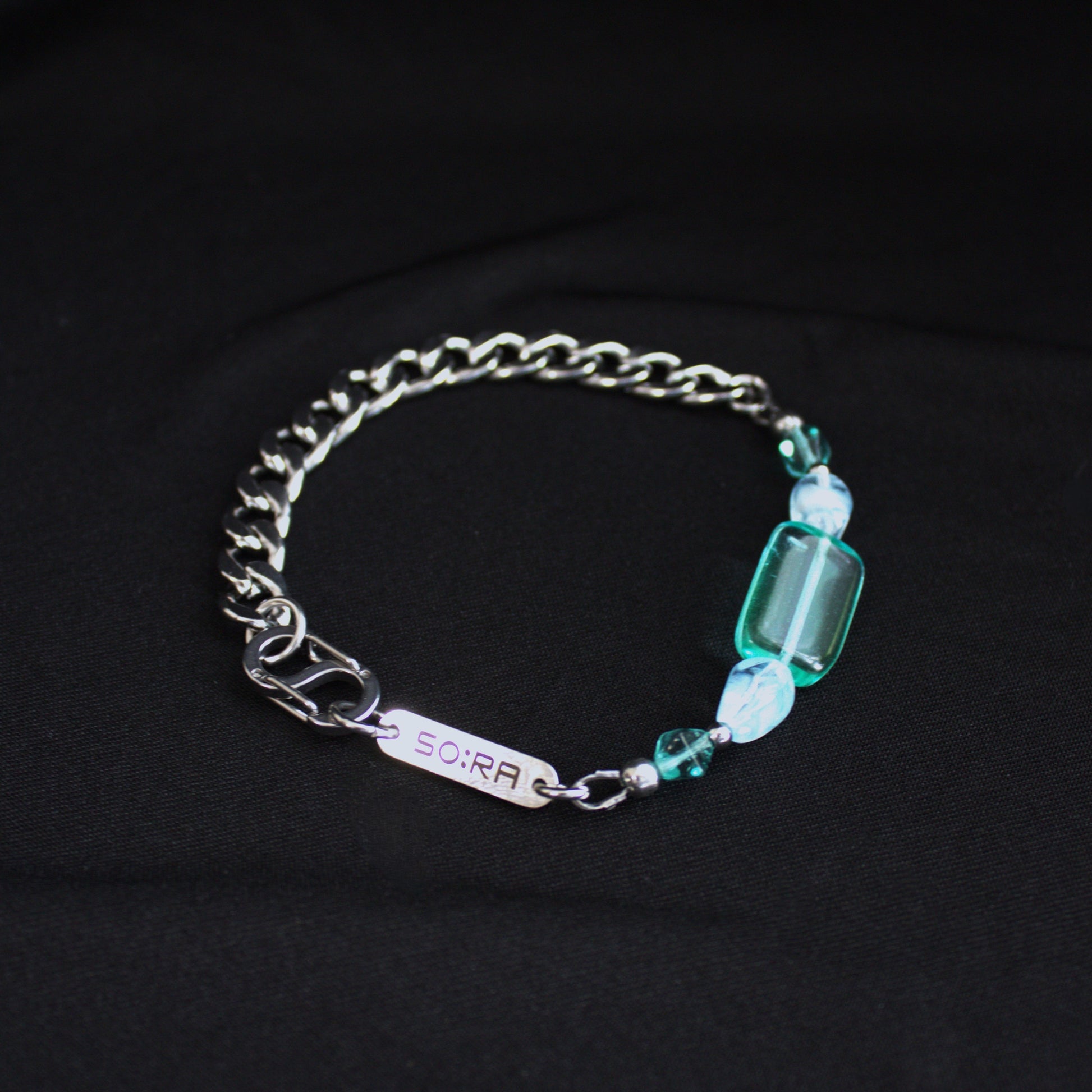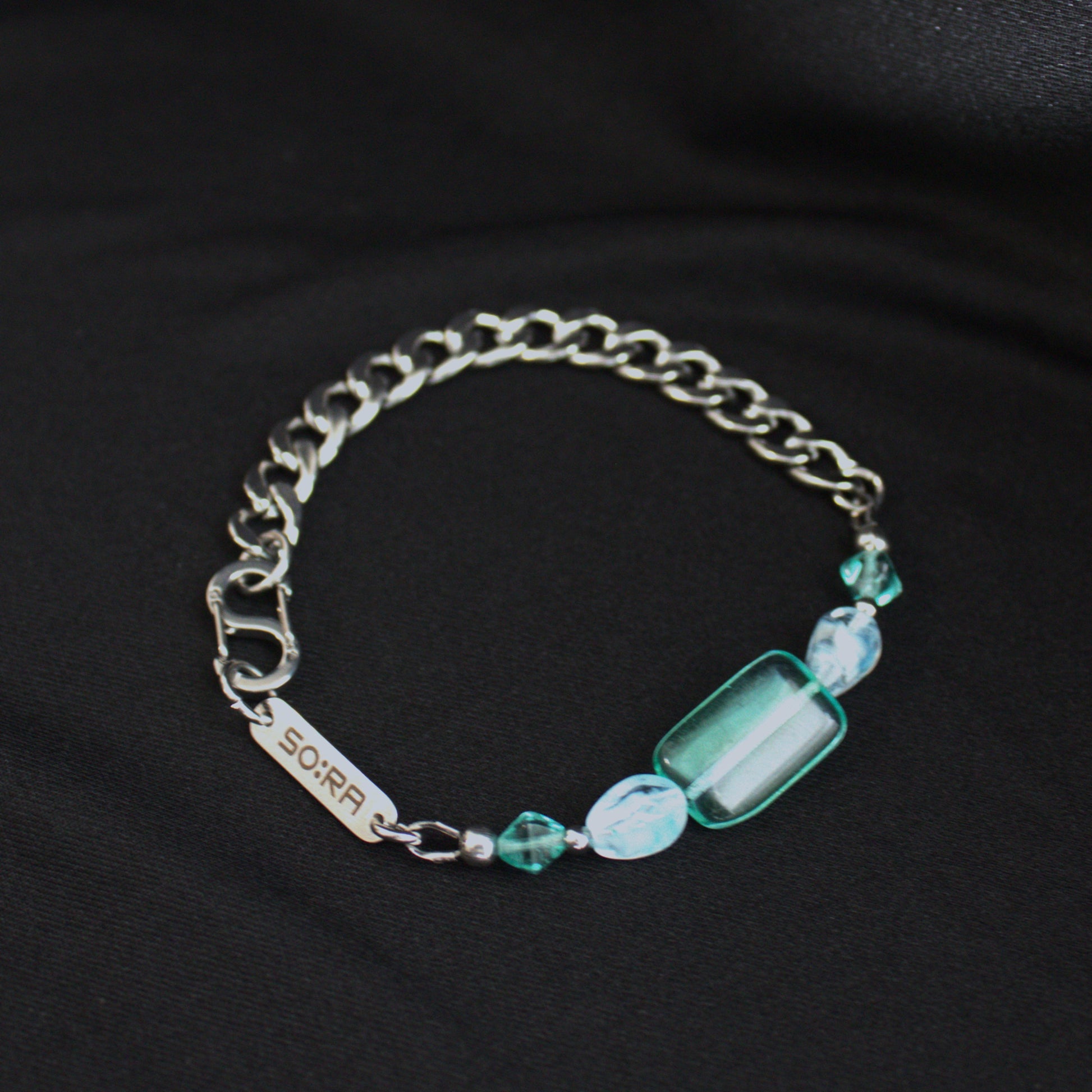 The Bracelet : 23PB from our Paradise Blues Collection blends urban strength with elegant shine. Handmade in Berlin, it features stainless steel links combined with Czech glass beads in a transparent, silver-glowing finish, creating a delicate highlight on the wrist.