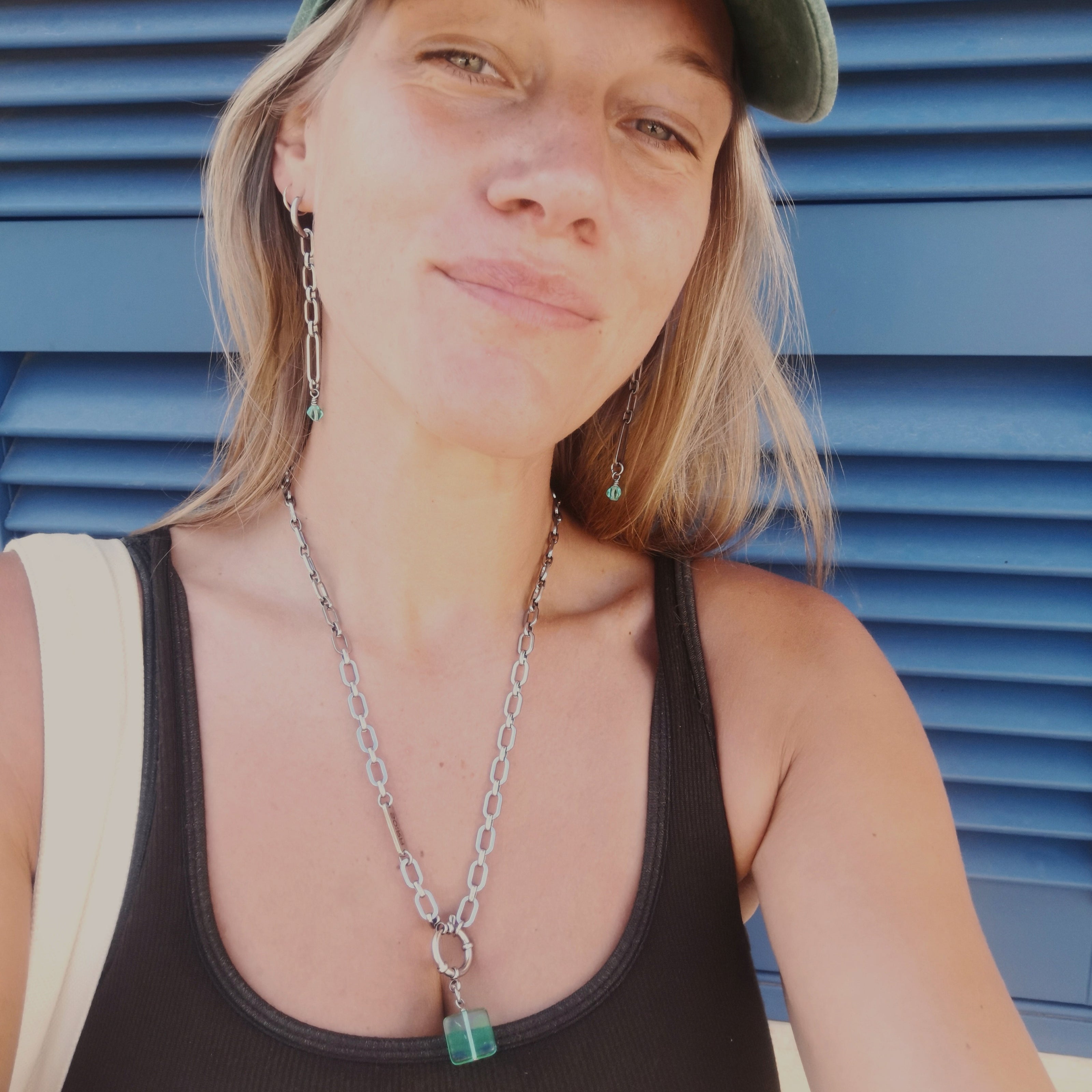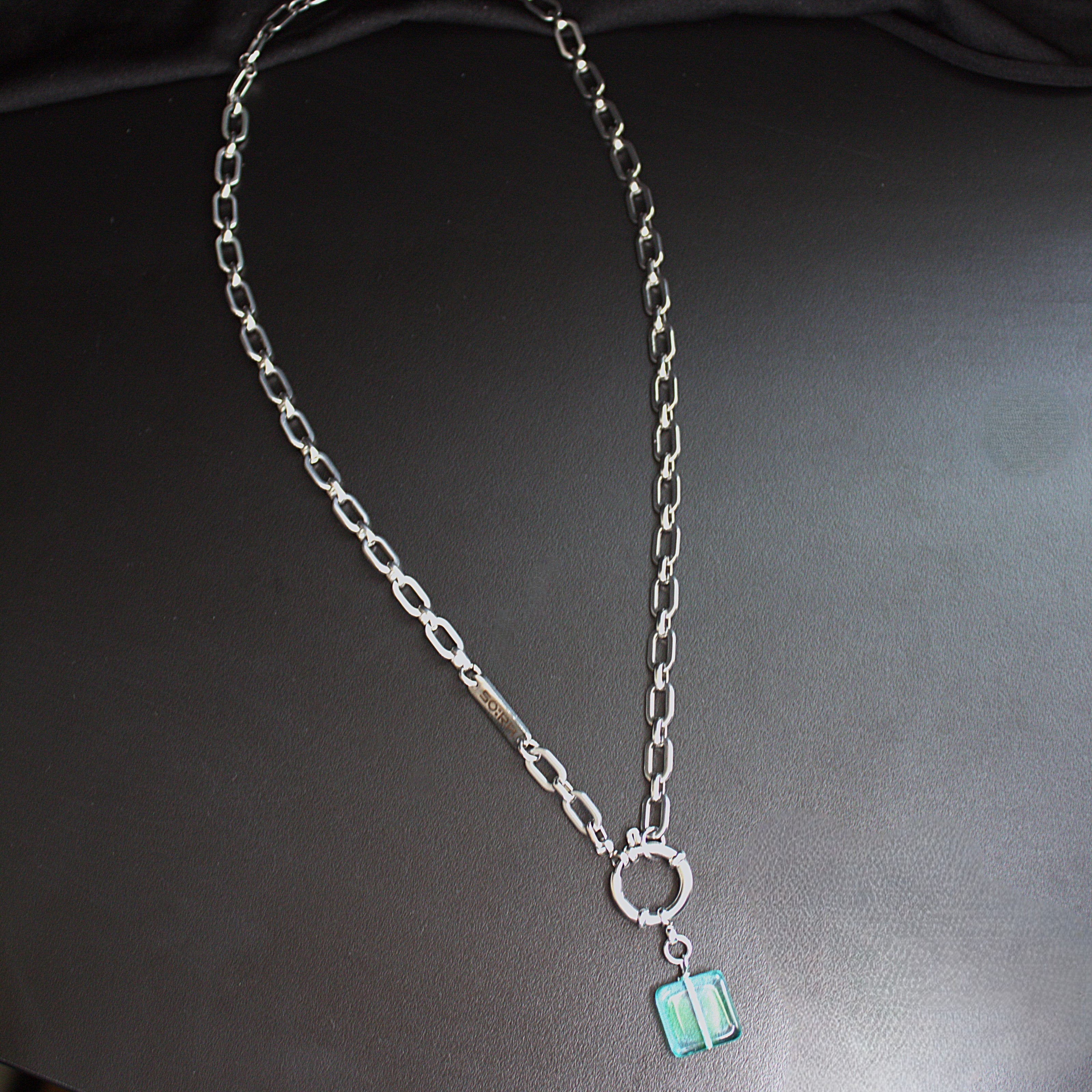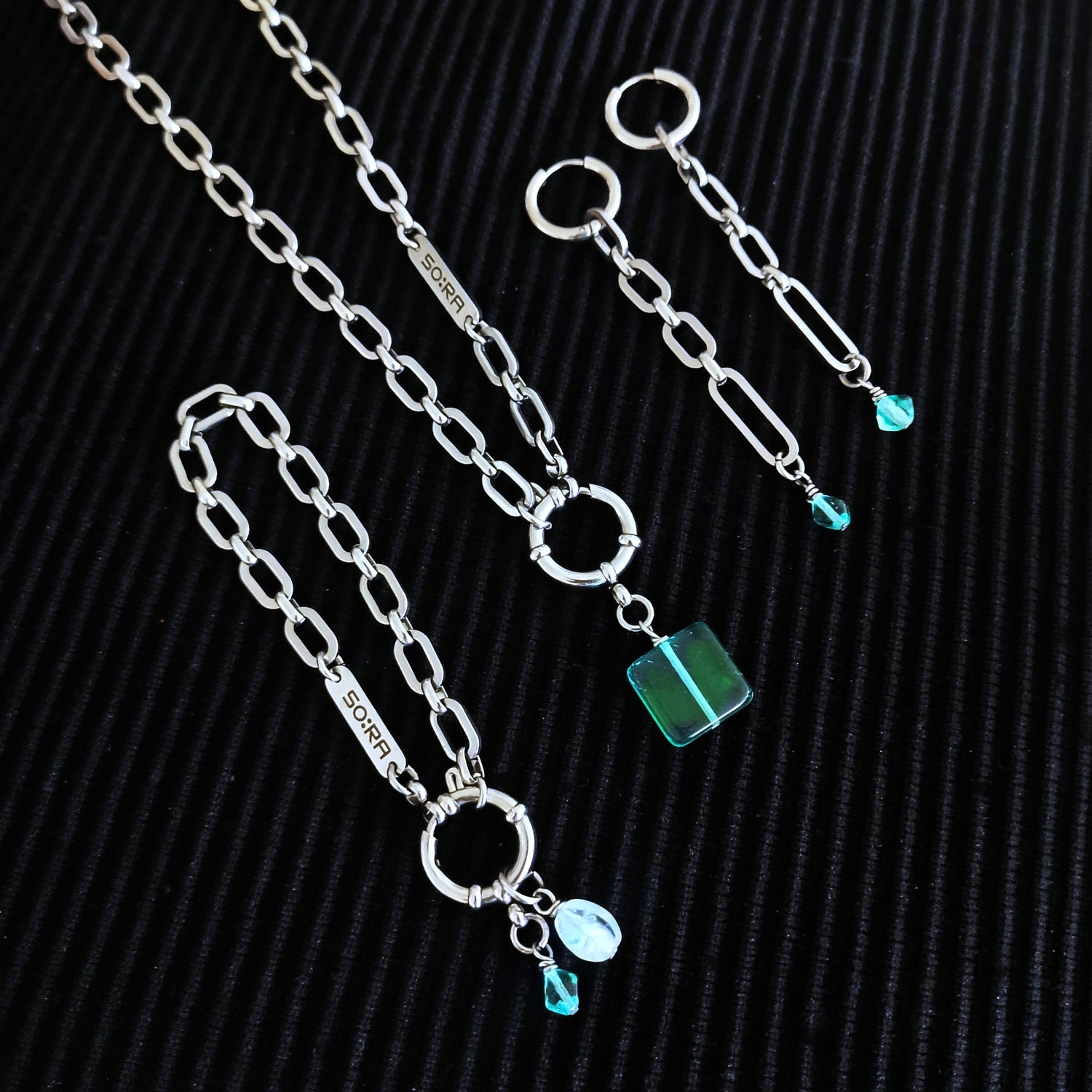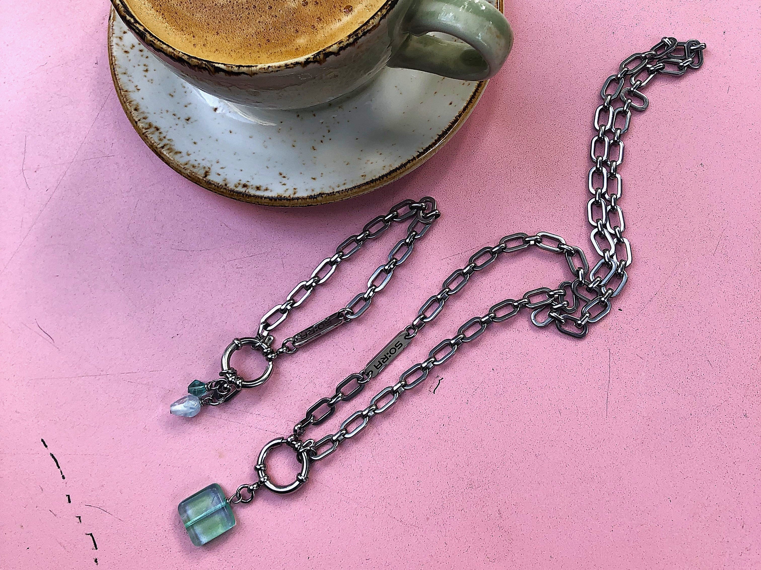 Handmade in Berlin and released only in limited quantities, the Necklace : 18PB carries SOIRA’s signature fusion of glass and steel. Complete your look by pairing it with the matching Bracelet : 28PB and Earrings : 98PB – the perfect set for those who value unique jewelry with personality.